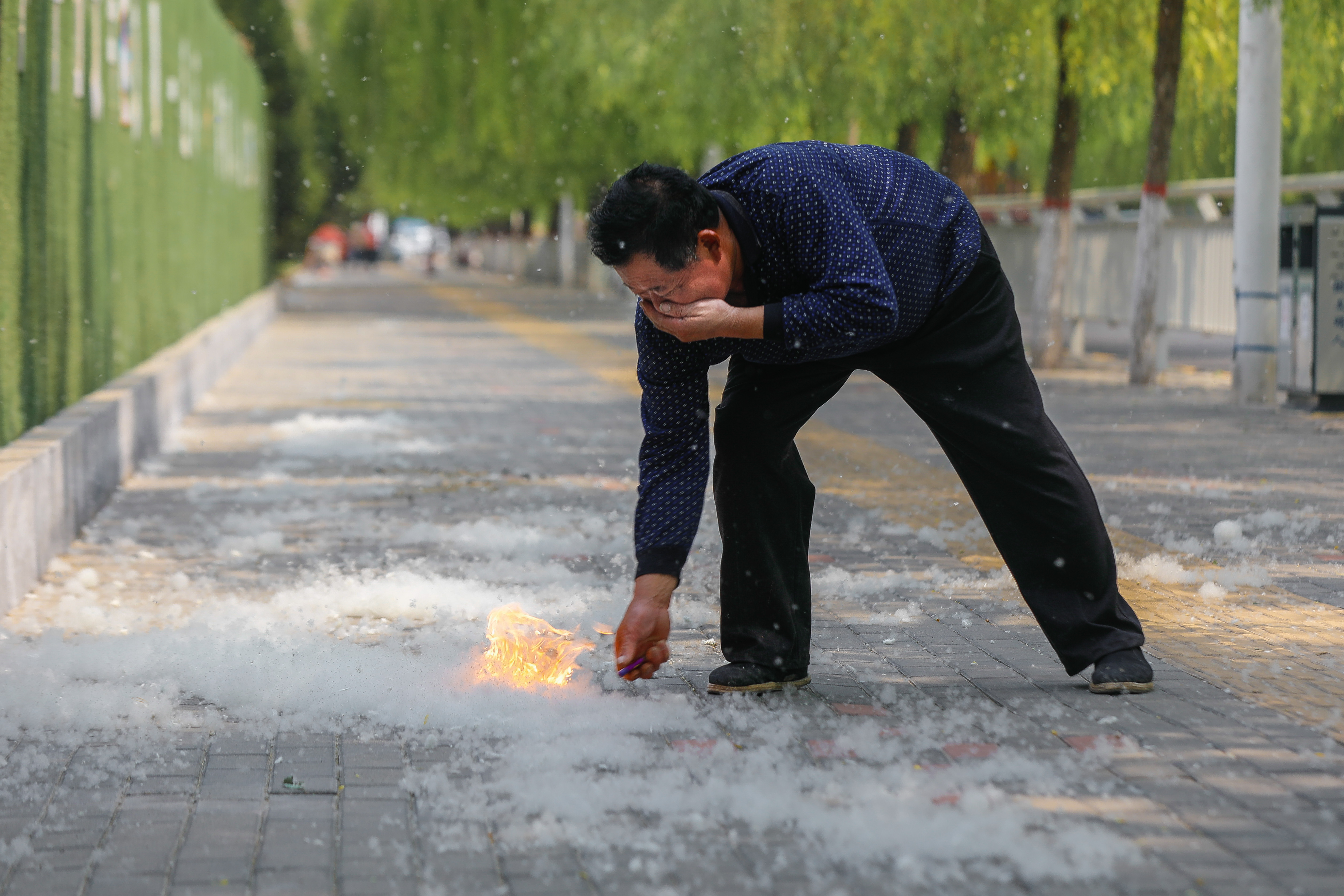 △郑州垂柳路上,一位路人正在点燃柳絮,大家切勿模仿。