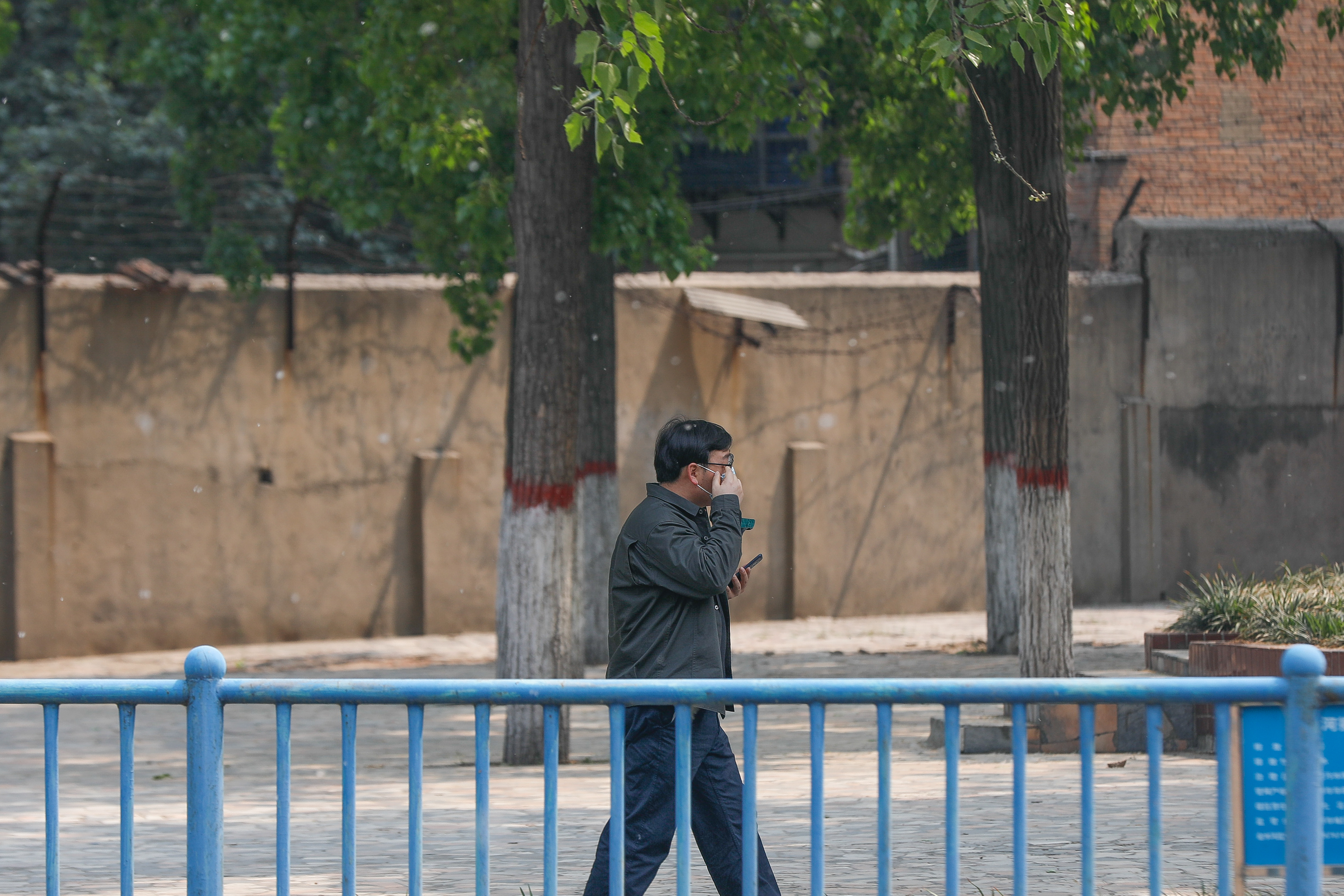 △郑州金水河滨河公园,一位行人被杨絮眯了眼睛。