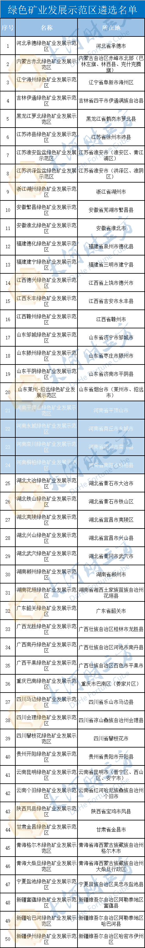 按照有关要求,在省级推荐的基础上,经过形式审查、专家评审、实地调研,共遴选出50家绿色矿业发展示范区。其中,河南入选的四家分别为河南平顶山绿色矿业发展示范区、河南永城绿色矿业发展示范区、河南栾川绿色矿业发展示范区、河南桐柏绿色矿业发展示范区。