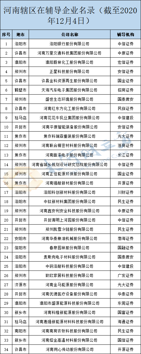 12月8日,记者从河南证监局网站获悉,河南辖区在辅导企业最新名录公布,截至12月4日,河南省共计34家IPO在辅导企业。