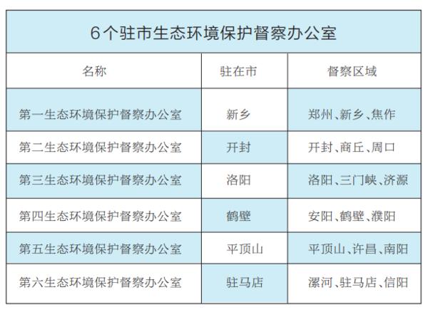为进一步强化生态环境保护督察职能,经省委机构编制委员会批准,河南跨区域设置6个生态环境保护督察办公室,作为省生态环境厅的派驻机构,驻市开展生态环境督察工作。