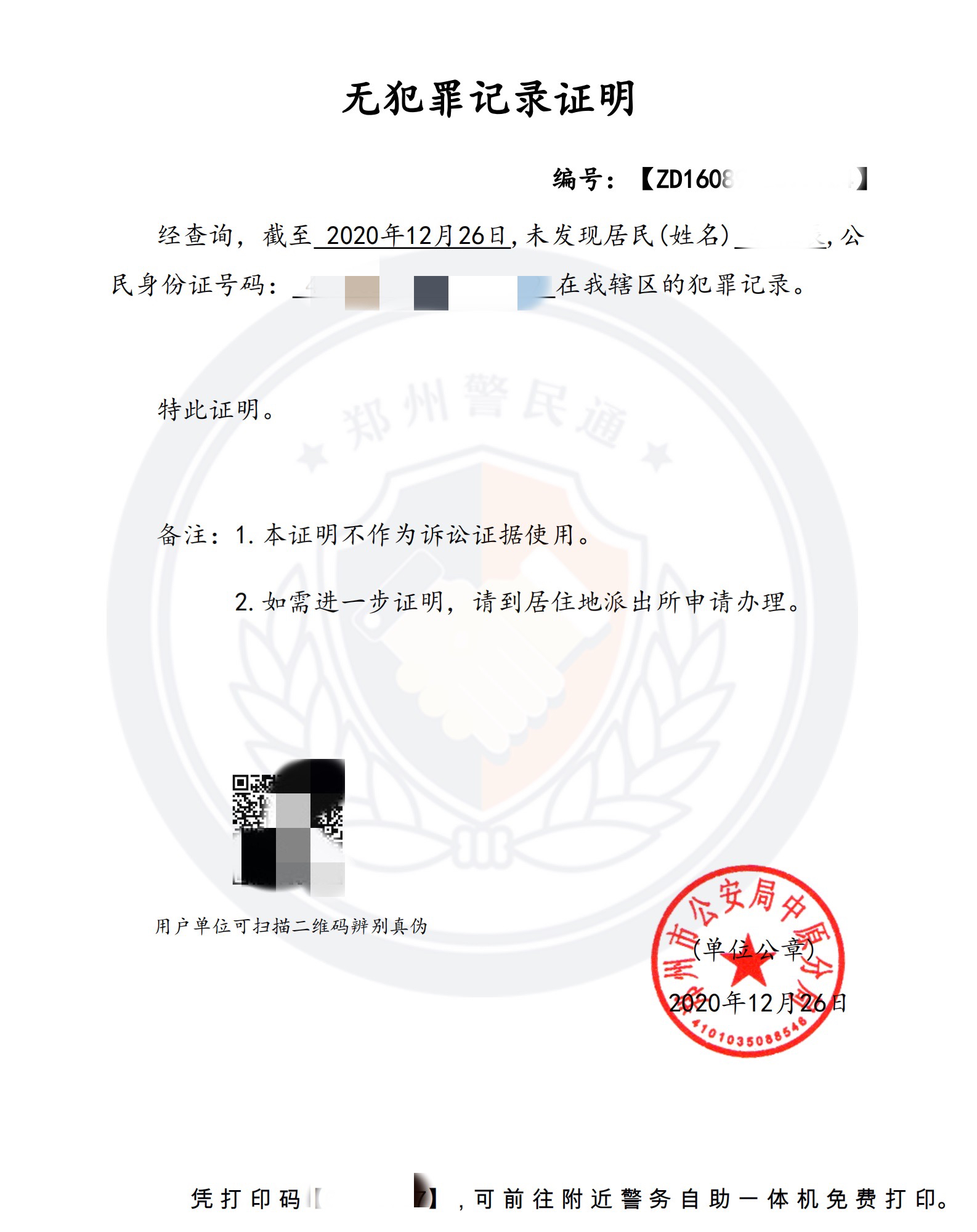 从12月26日起,郑州市民从微信中打开“郑州警民通”办理无犯罪记录证明,通过郑州市公安局实名认证即可获取无犯罪记录证明,凭打印码,可自行打印,也可前往附近警务自助一体机免费打印。