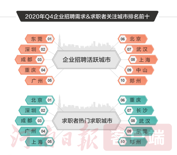 和樊碧函一样,越来越多的优秀学子把事业发展之地选择在郑州这座新一线城市。近日,58同城招聘研究院发布2020年第四季度人才流动大数据显示,在企业招聘活跃城市TOP10和求职热门城市TOP10中,郑州均跻身全国前十,北方城市仅北京、郑州入列。