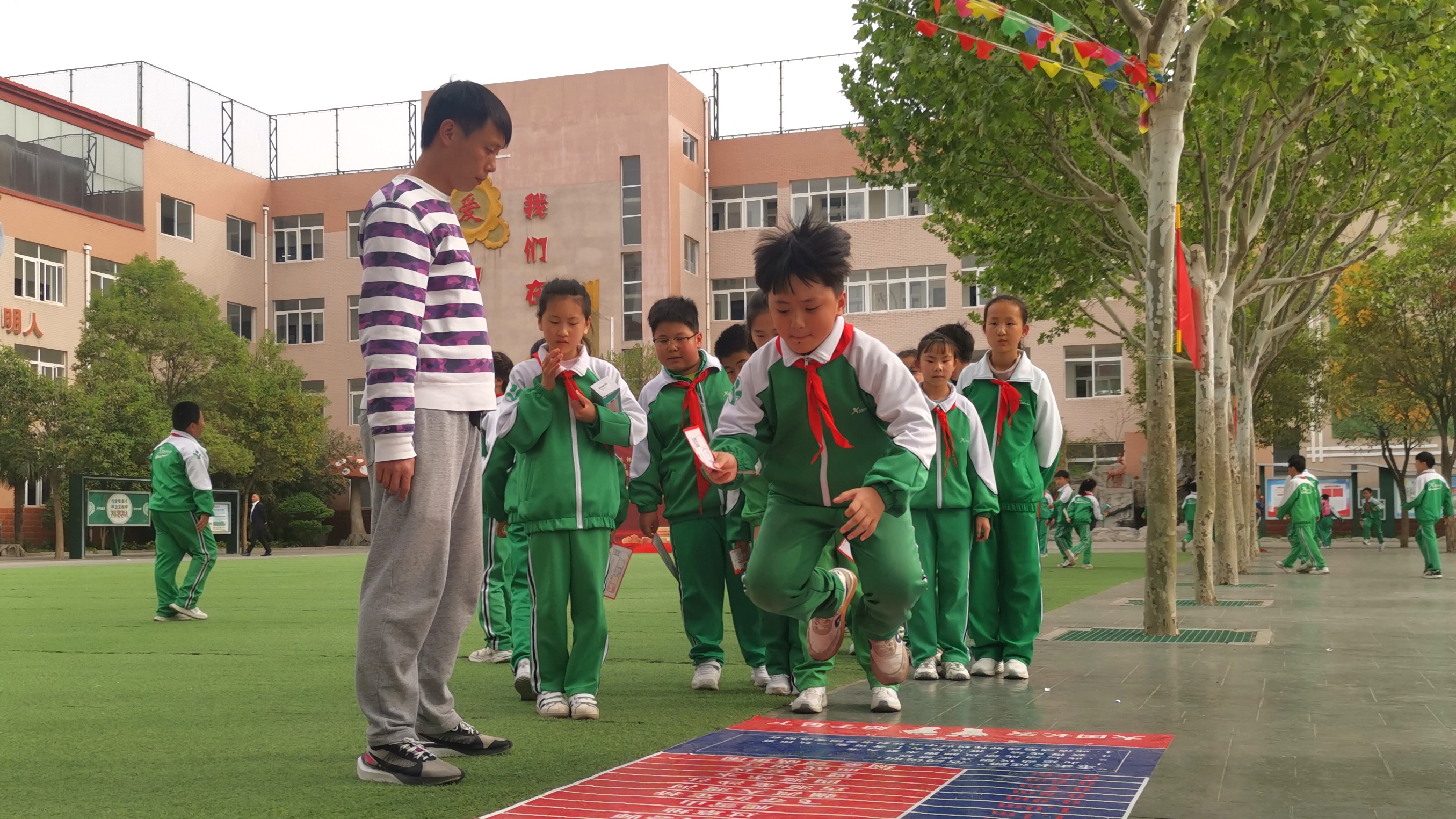 参加立定跳远。有了健康的身体,才能更好维护国家安全。