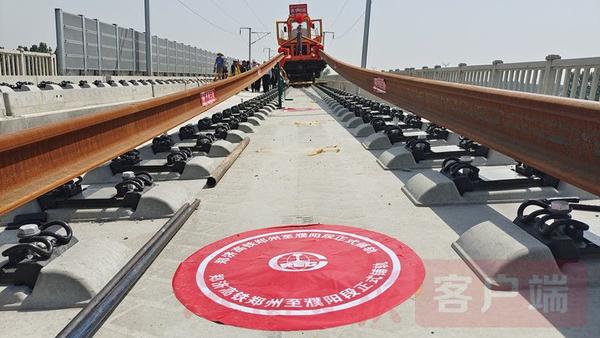 5月30日10时18分,在郑济高铁濮阳段施工现场,铺轨机将500米长钢轨安全平稳落放到了道床上。这标志着,郑济高铁河南段正式进入铺轨阶段。