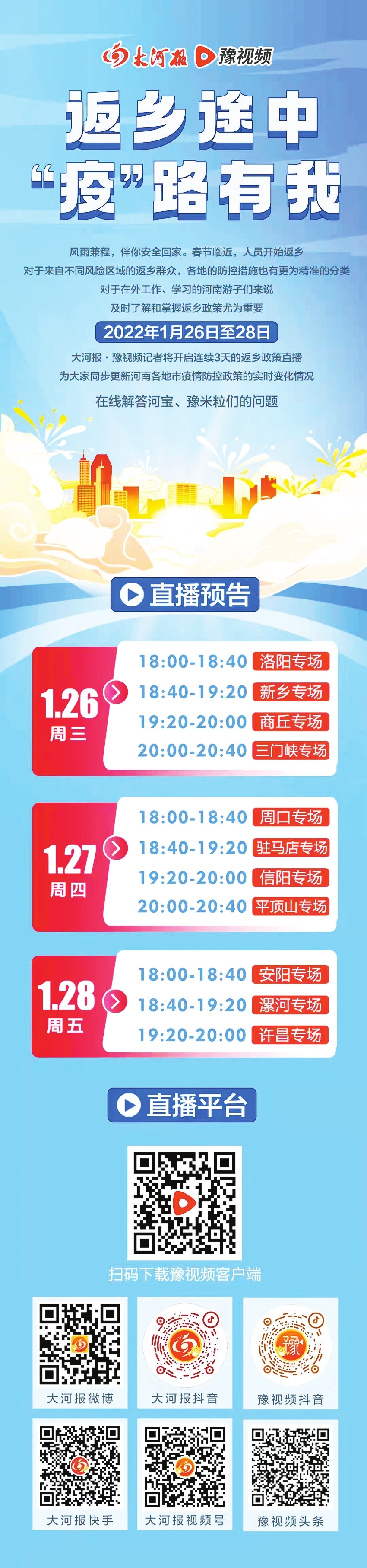 □大河报·豫视频记者李玉坤王耀成杨小燕黄婷 昨晚,大河报·豫视频开启的“返乡途中,‘疫’路有我”系列直播活动持续引发关注,周口、驻马店、信阳、平顶山等4地市记者直播160分钟,全网在线围观突破13万人...
