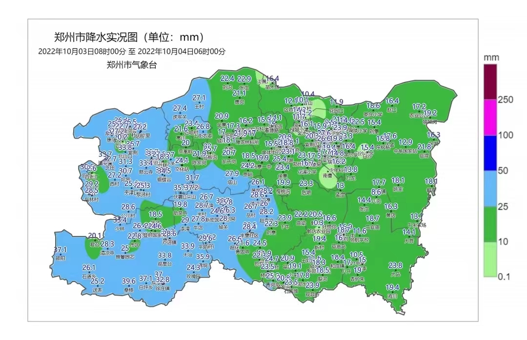 其中,降水量在25.0-49.9毫米的站点有76个,10.0-24.9毫米的站点有121个,雨量较大的站点有登封市的桑楼39.6(毫米,下同),颍阳37.1,白坪乡37.1;巩义市的南岭38.6,紫荆36.7,大峪沟35.7;新密市的尖山37.2,伏羲山35.9,平陌35.2;上街区的上街农委26.8,石咀村23.4,五云山22.0;二七区的尖岗25.4,郑州国家站23.5,侯寨23.4;荥阳市的环翠峪31.7,塔山27.9,虎牢关27.4;郑东新区的商鼎路23.3,锦绣小学22.5,普惠19.8;中原区的帝湖23.1,阳光小学22.8,市政府21.1;新郑市的青岗庙25.3,观音寺23.9,石固堆23.5;航空港区的大马23.8,洧川19.4,香炉朱19.0;中牟县的官渡21.8,狼城岗19.2,姚家18.1;金水区的四十七中27.6,聚源路26.6,龙子湖23.9;经开区的十一中17.8,列子小学16.4,少年科技16.2;高新区的万科小学15.5,外国语14.1,春藤路12.0;管城区的绿之声19.4,气象局17.5,花溪小学16.7;惠济区的苗木场16.4,区政府12.1,花园口11.9。
