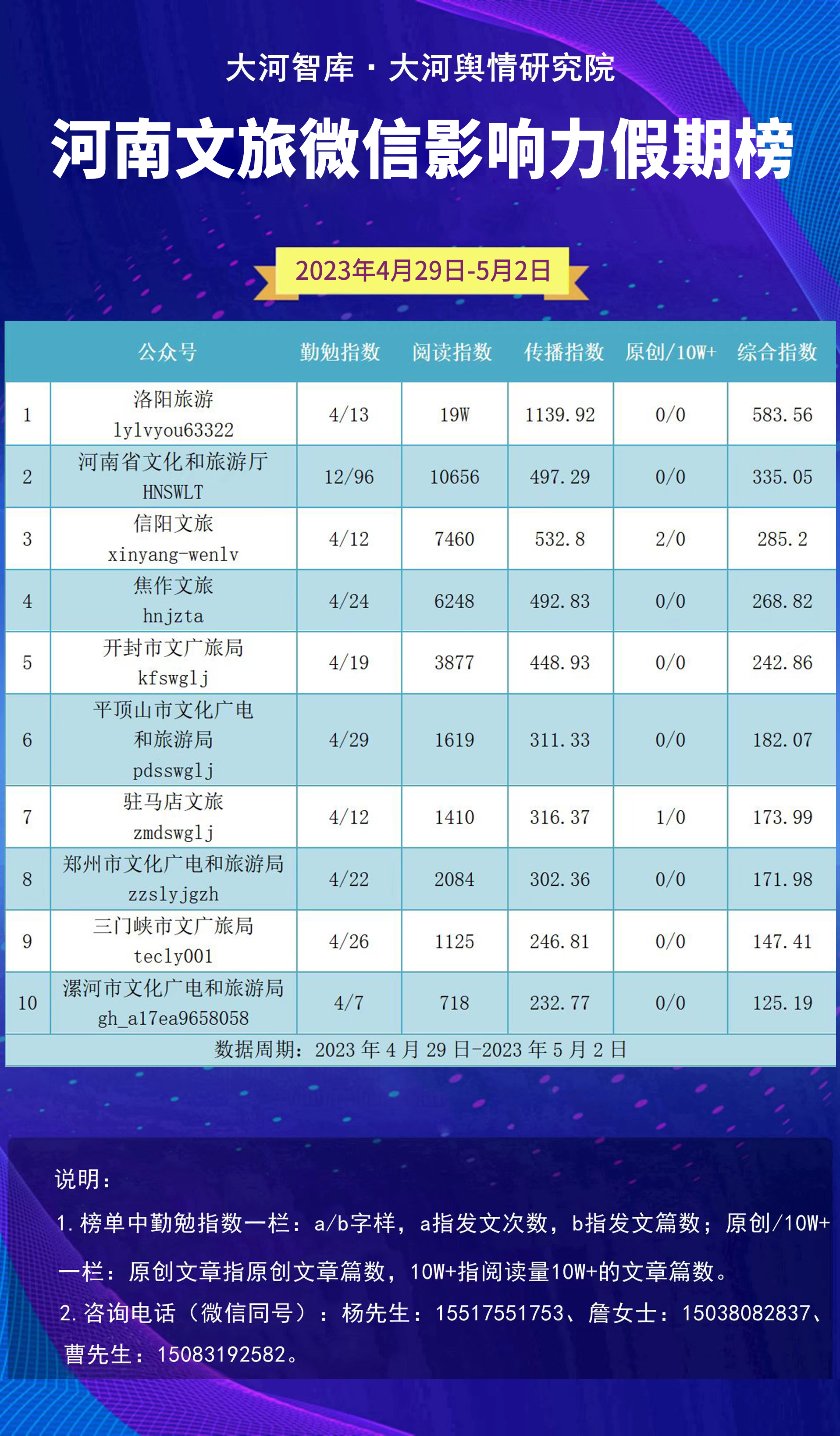 2023河南文旅微信影响力假期榜显示,2023年“五一”假期期间,洛阳旅游微信公众号发布4次,其中,《重磅!洛阳旅游年票新增两个4A级景区》《刚刚!洛阳多家景区发布最新公告》《洛阳,欢迎您来,欢迎您再来!》等13篇文章阅读总量达到19万次,微信公众号的传播指数高达1139.9175,综合指数为583.56,位居榜首。