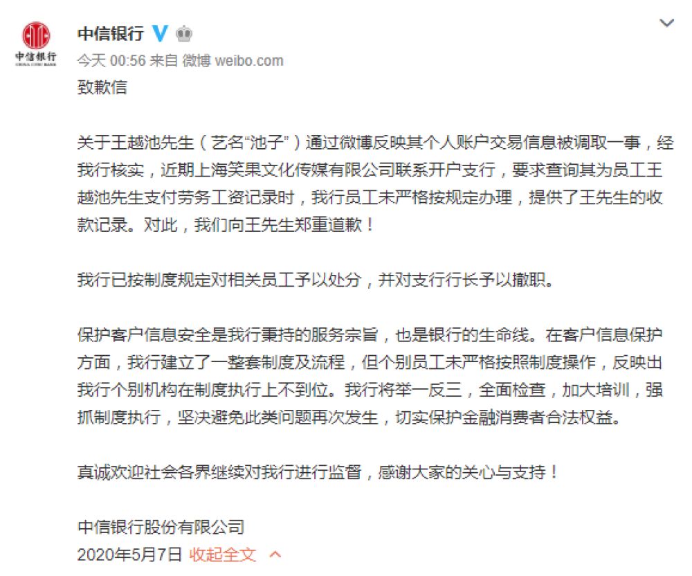 5月6日下午,脱口秀演员池子(本名:王越池)在微博发文称,在与上海笑果文化传媒有限公司(下称“笑果文化”)的经济纠纷中,发现对方非法获取自己的中信银行账户交易明细作为案件材料,并因此发出律师函。7日凌晨,中信银行官方微博发布致歉信,并对支行行长予以撤职。