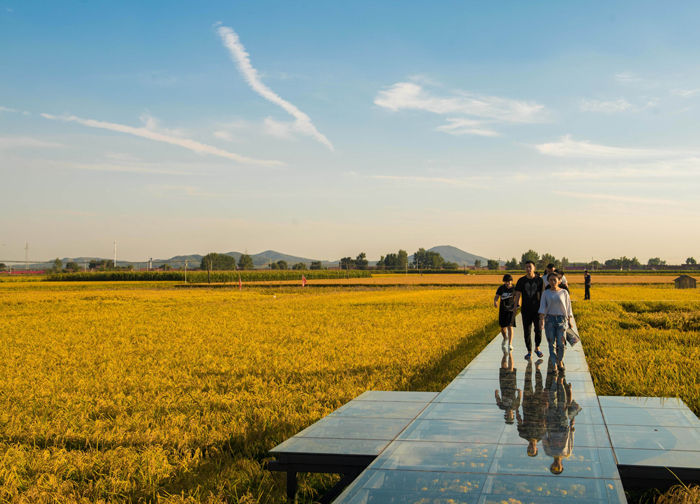 在吉林省舒兰市白旗镇松江村,游人行走在稻田间的玻璃栈道上 新华社记者 许畅 摄
