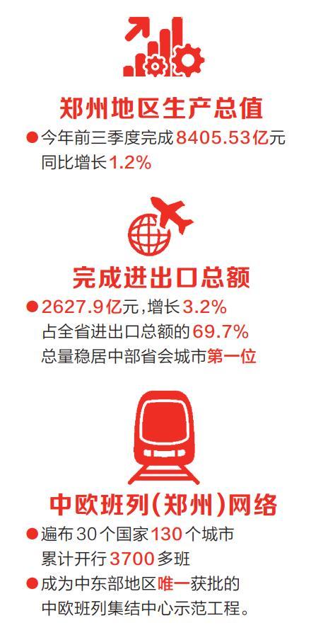 从“量的积累”到“质的飞跃”,郑州经济“体格”在强健,“韧性”在增强。2019年,郑州市完成地区生产总值1.16万亿元,在全省的比重提升至21.4%,总量在全国大中城市中居第15位。今年以来,郑州统筹推进疫情防控和经济社会发展,整体经济复苏向好,前三季度,地区生产总值完成8405.53亿元,同比增长1.2%;完成进出口总额2627.9亿元,增长3.2%,占全省进出口总额的69.7%,总量稳居中部省会城市第一位。国内外影响力、辐射力、带动力持续提升,引领中原崛起的龙头越昂越高。