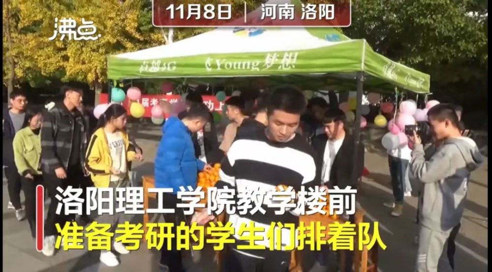 2.11月8日,我校教学楼前,考研学生排着队领到了学校免费发放的橙子和棒棒糖。每一个橙子上面写有:上岸、必胜、保过等加油语。刘芳老师介绍,这是他们给考研学生加油助威的活动,橙子寓意着“心想事成”;棒棒糖,寓意着“棒棒的”。学生称,感到很暖心,考研更有冲劲。