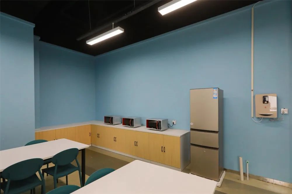 休闲区:提供微波炉、冰箱、自助饮水设备、休闲桌椅,满足学生饮食和放松身心需求;
