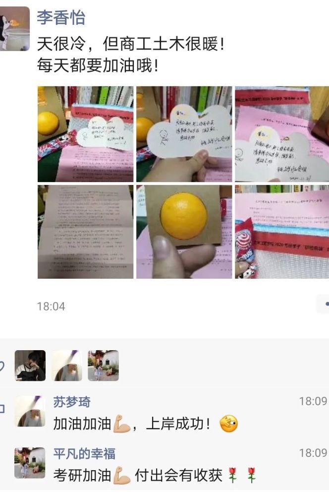商丘工学院安排指导老师对考研学子进行一对一帮扶,从考研复习、报考志愿、调剂、面试等做好帮扶,成立了答疑值班表、专业课帮扶群,建立“云上帮扶团”,考研成功学长分享经验,挂牌考研自习室、考研教室、考研宿舍等。录制考研纪录片,为考研学生写祝福语,开展考研学生考前释压团体辅导活动,让学生在冲刺阶段轻松备考。为考研学子送“脐橙福袋”加油包。一个脐橙寓意“‘脐’开得胜”、一支棒棒糖寓意“棒棒哒”、每个福袋里还装有一封“一封家书”“一张辅导员老师亲笔手写的祝福卡片”。