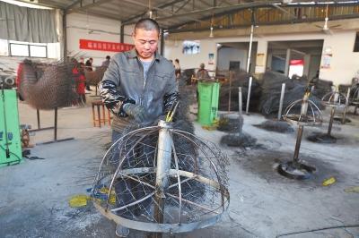 室外北风凛冽、寒冷刺骨,室内机杼声声、欢笑连连。12月3日,淮滨县固城乡王营村富友铁丝网加工厂内,20多位农民各司其职,取料、编织、串联、挂件、定型,一条流水线下来,一张用铁丝编织的树根网便做成了。