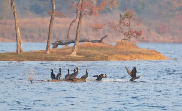 “鲇鱼山水库内岛屿密布,植被茂密,水色清澈,有丰富的渔业资源,是中华秋沙鸭等候鸟栖息的理想之所。目前在鲇鱼山水库栖息的中华秋沙鸭数量多达60余只,是近年来发现数量较多的一次,它们通常10月以后飞来过冬,来年4月份底左右才迁徙走,停留时间达6个月之久。”河南大别山国家级自然保护区鲇鱼山片区副主任胡焕福告诉记者。