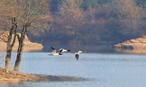 波光粼粼的浩淼水面上,几十只头戴红冠、白身黑羽的中华秋沙鸭,或自由自在地飞翔,或轻巧地掠水而过,或快乐地嬉戏,或专注地觅食·····这是连日来一些摄影爱好者在商城县鲇鱼山水库拍到的景象。近期,气温骤降,天气渐冷,一年一度的候鸟迁徙季来临,许多鸟群选择在山水秀美的商城县停留、栖息、觅食。