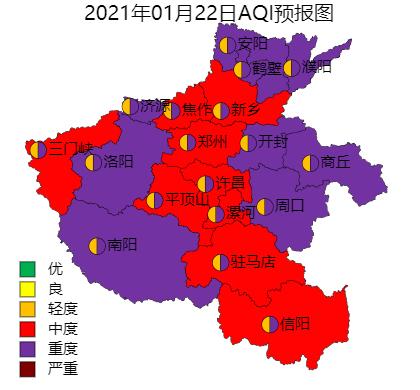 22日至23日,扩散条件较差,湿度较高,早晚有逆温。全省大部分地区会出现中度至重度污染过程。预计日均:驻马店、信阳为轻度或中度污染,其它地区为中度或重度污染。首要污染物为PM2.5。
