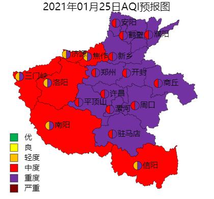 25日,白天,全省处于均压场中,仍有大范围中度至重度污染过程;夜间,冷空气影响我省,西部地区略有好转。预计日均:全省以中度至重度污染为主。首要污染物为PM2.5。