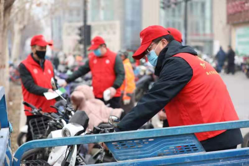 1月27日,为营造干净整洁的市容市貌和文明有序的交通环境,郑州市钱塘街银基商贸城周边的“绿城啄木鸟”志愿者们,忙碌地指挥着过往非机动车及共享单车的停放。