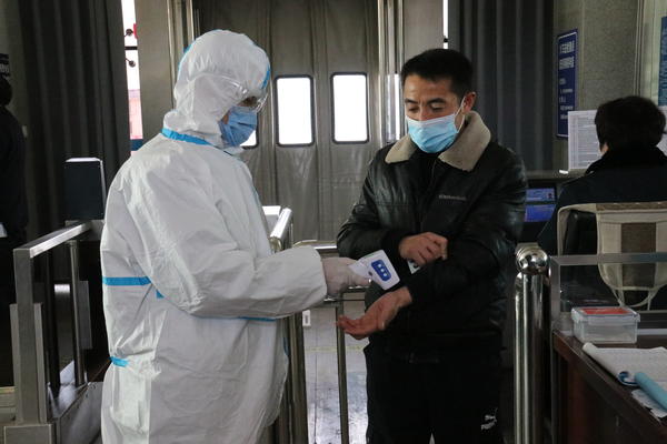 ▲三门峡火车站进站口,旅客接受体温测量