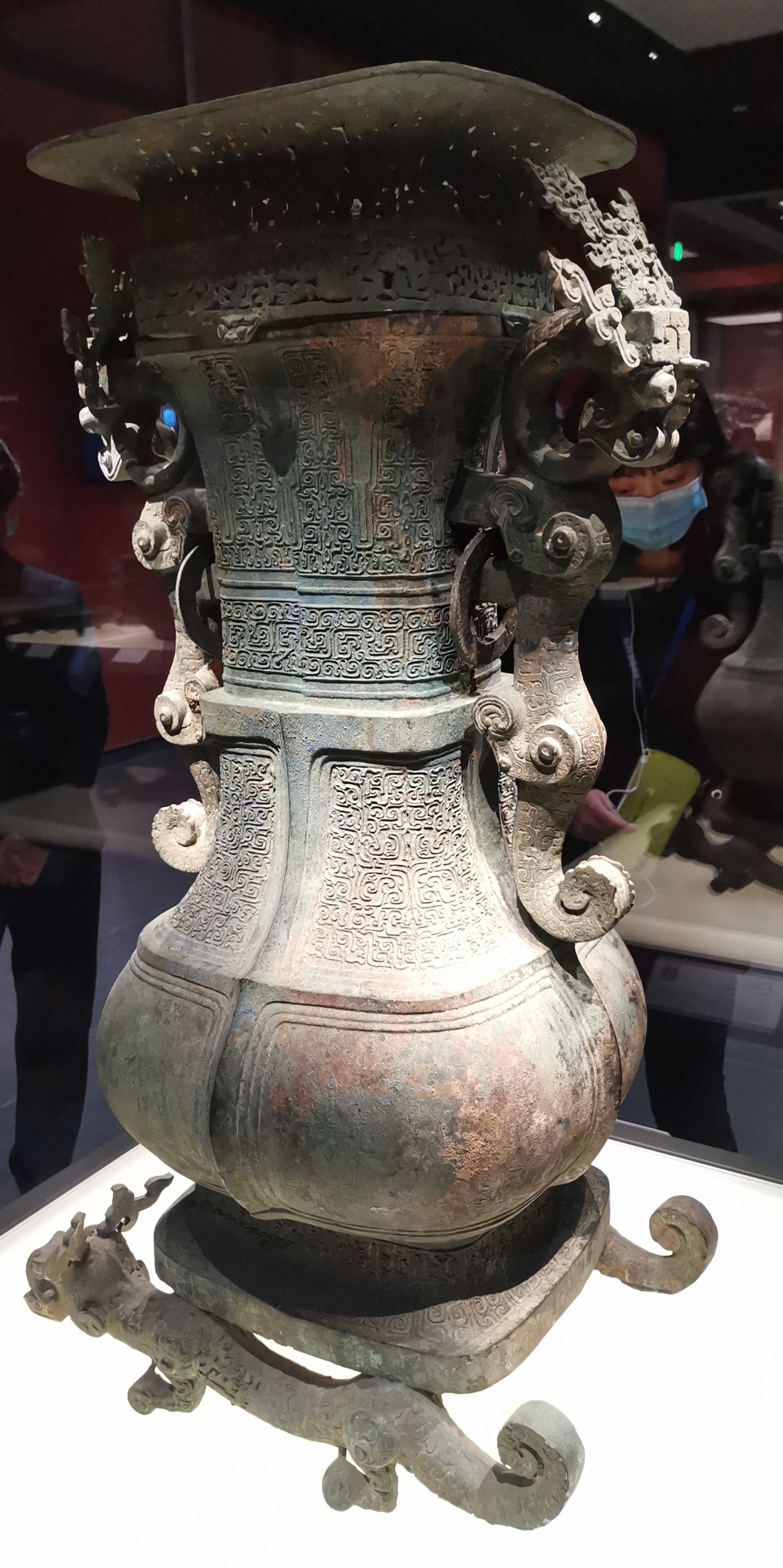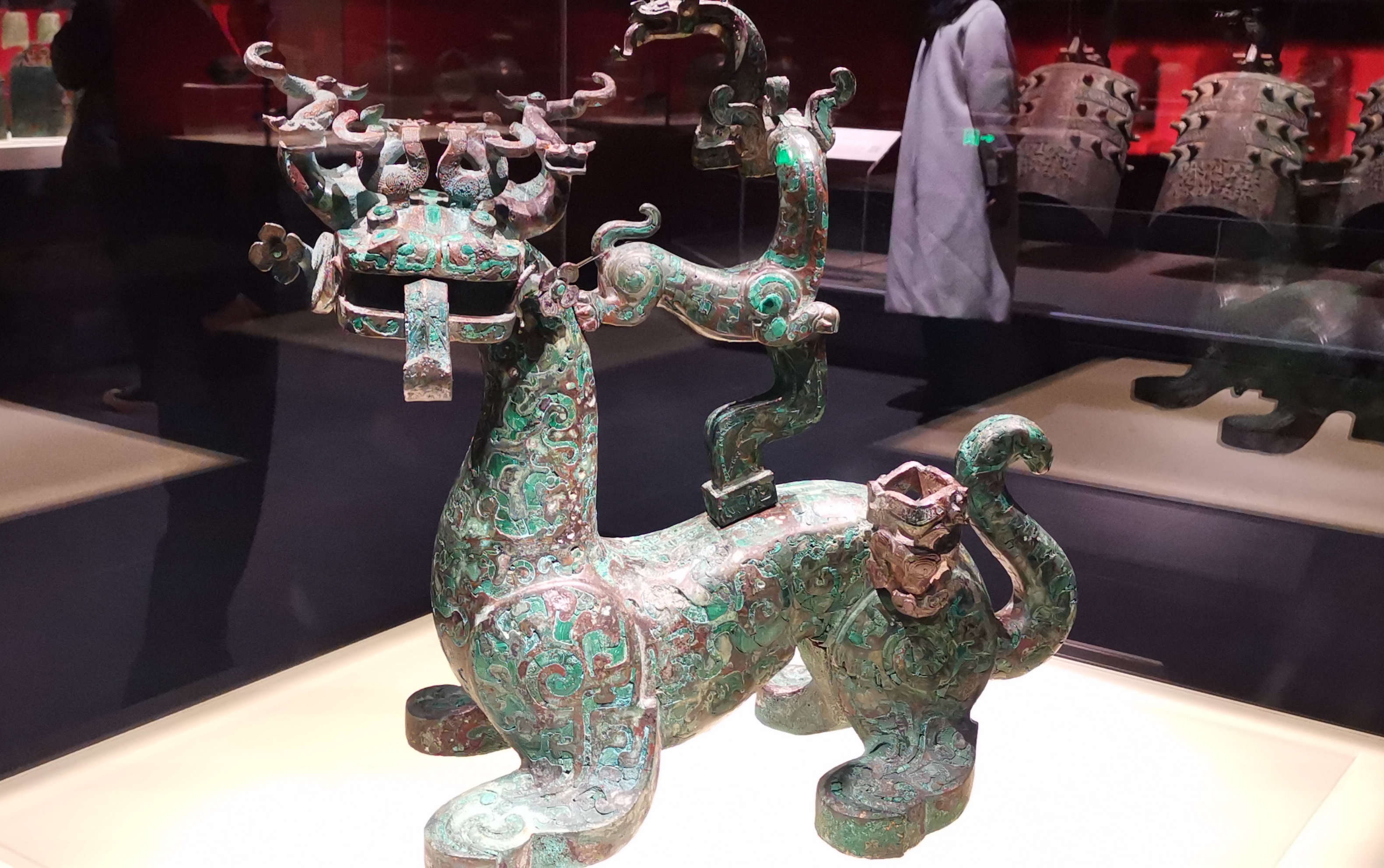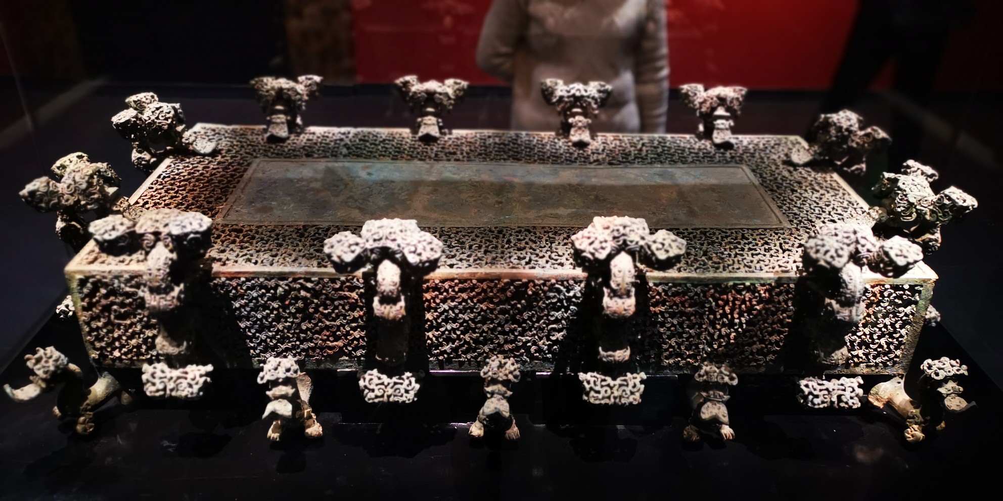 在此次展览中的明星展品便是曹汉刚最喜欢的云纹铜禁,其出土于下寺春秋楚墓,是一种承置酒器的案,一般放置于宗庙里,类似现代的“茶几”。器物身饰多层镂空云纹,十二只龙形异兽攀附于四周,另十二只蹲于禁下为足,设计巧妙,瑰丽庄严,纹饰镂空内外五层,剔透玲珑。