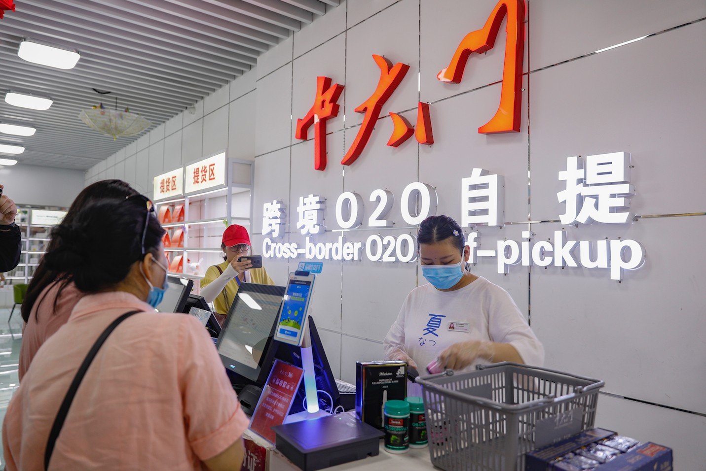 顾客在郑州中大门跨境O2O自提店购物(摄影/贺志泉)