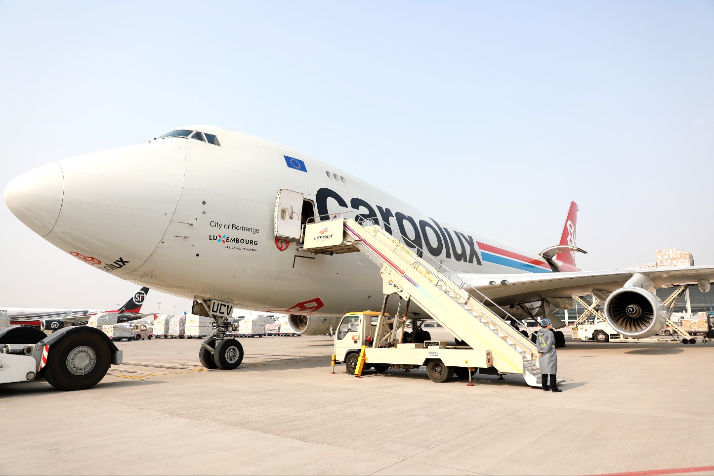 郑州机场卢森堡货航的飞机正在装运物资(摄影/贺志泉)