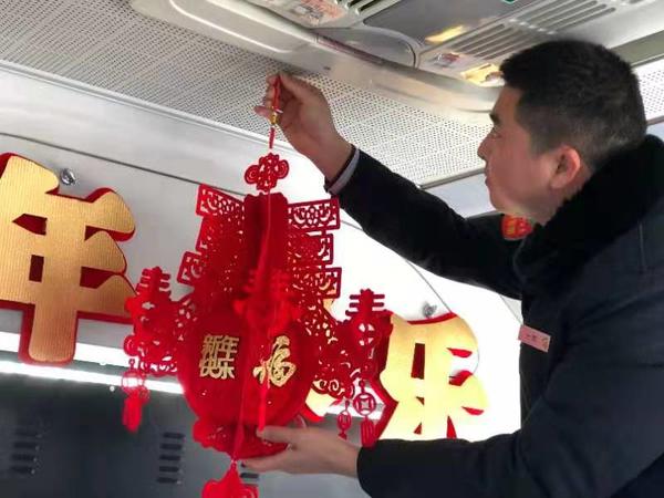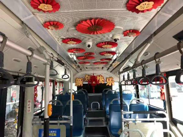 郑州公交集团第一运营公司四车队B12路车长姚彬华为迎接2021年新春佳节,利用休息时间将车厢打扮成“迎新春主题车厢”,受到乘客的一致喜爱和好评。