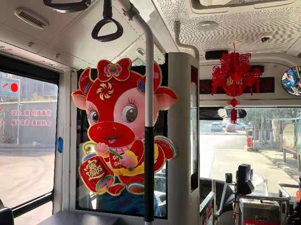走进B12路公交车厢,火红的灯笼挂满车厢,一张张福字窗花细心地贴到车窗上,车内萌萌的小牛贴纸、喜气的福字,都能让乘客们提前感受到温馨喜庆的节日气氛。