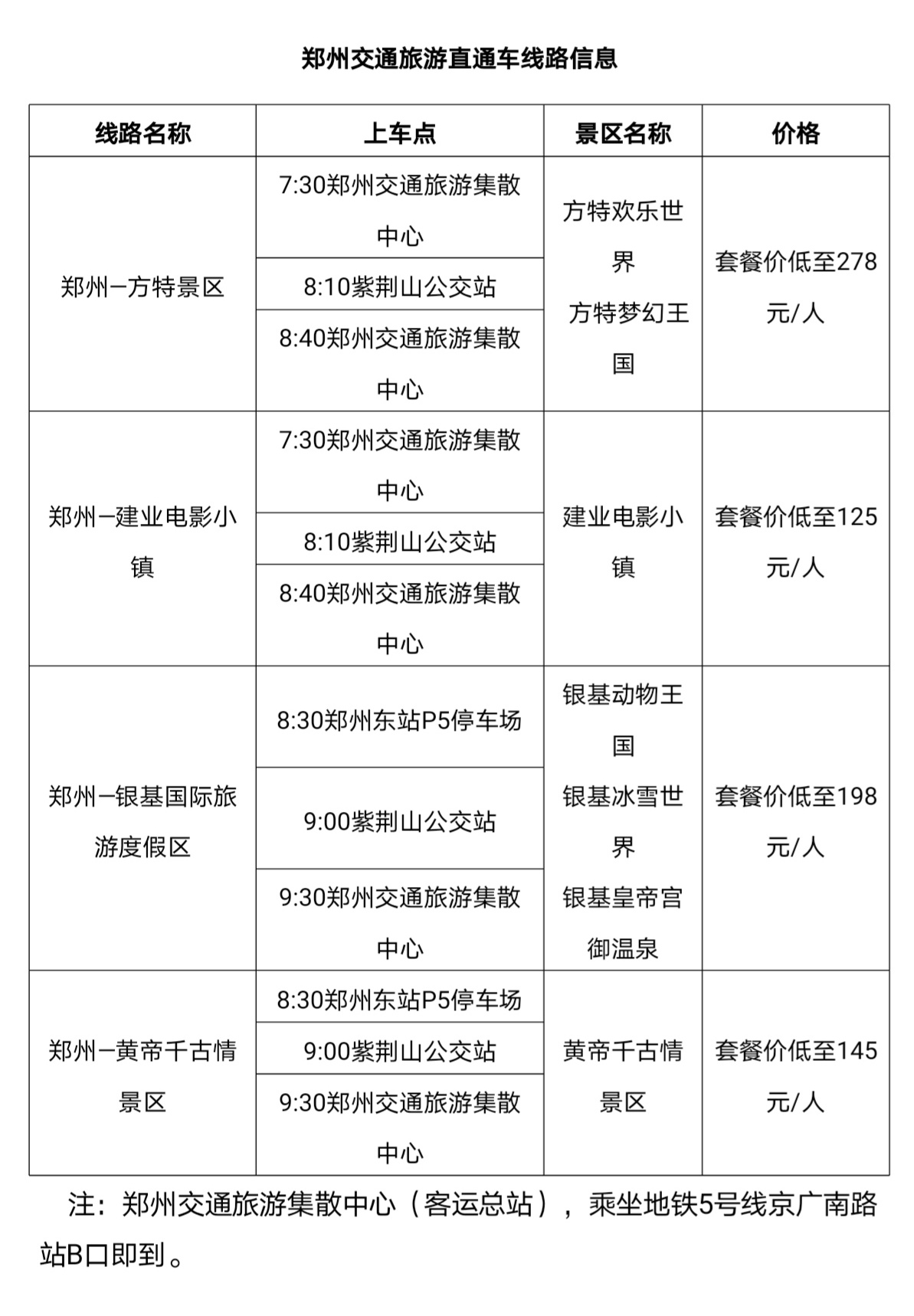 郑州交通旅游集散中心(原客运总站)旅游直通车,逢节假日及景区主题活动,将根据客流情况适时增发班次,努力给游客和市民提供自由灵活的旅游出行方式。