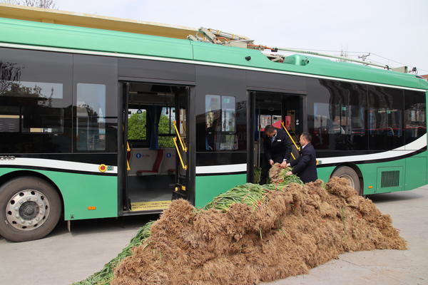 3月24日一大早,装着蒜苗的火车开进快速公交电厂路公交站,一股蒜苗香气从中飘出。 许多想要参与采购的职工早早地就来到了场区中,等着开始认购。