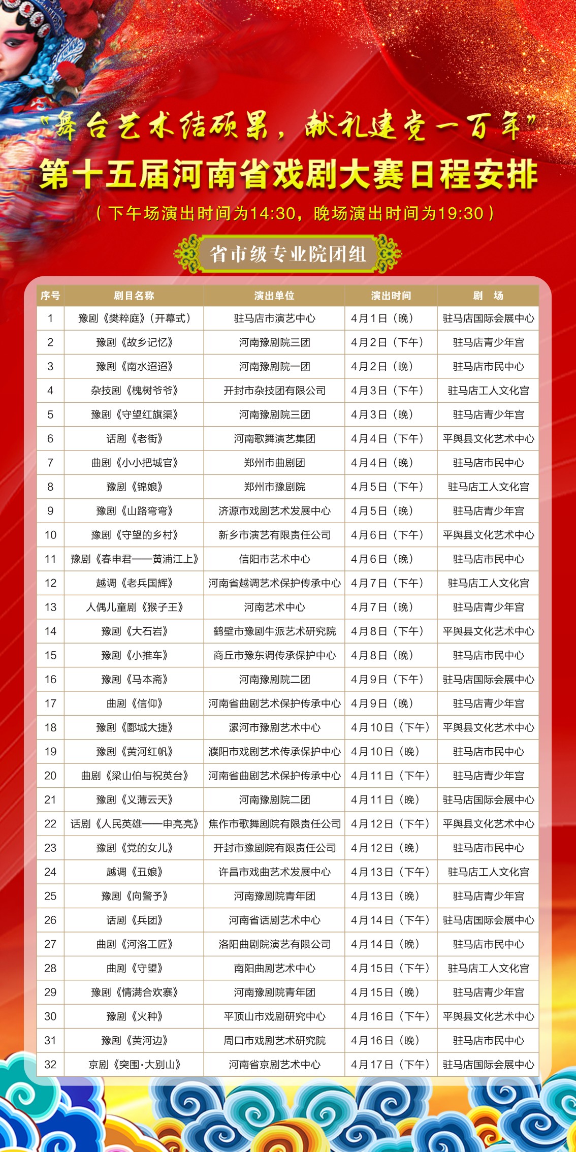 大河网讯(记者莫韶华)豫剧、曲剧、蒲剧、道情、话剧、杂技……好戏连台。3月30日,记者从河南省文化和旅游厅获悉,“舞台艺术结硕果,献礼建党一百年”第十五届河南省戏剧大赛将于4月1日在驻马店隆重开幕。本次大...