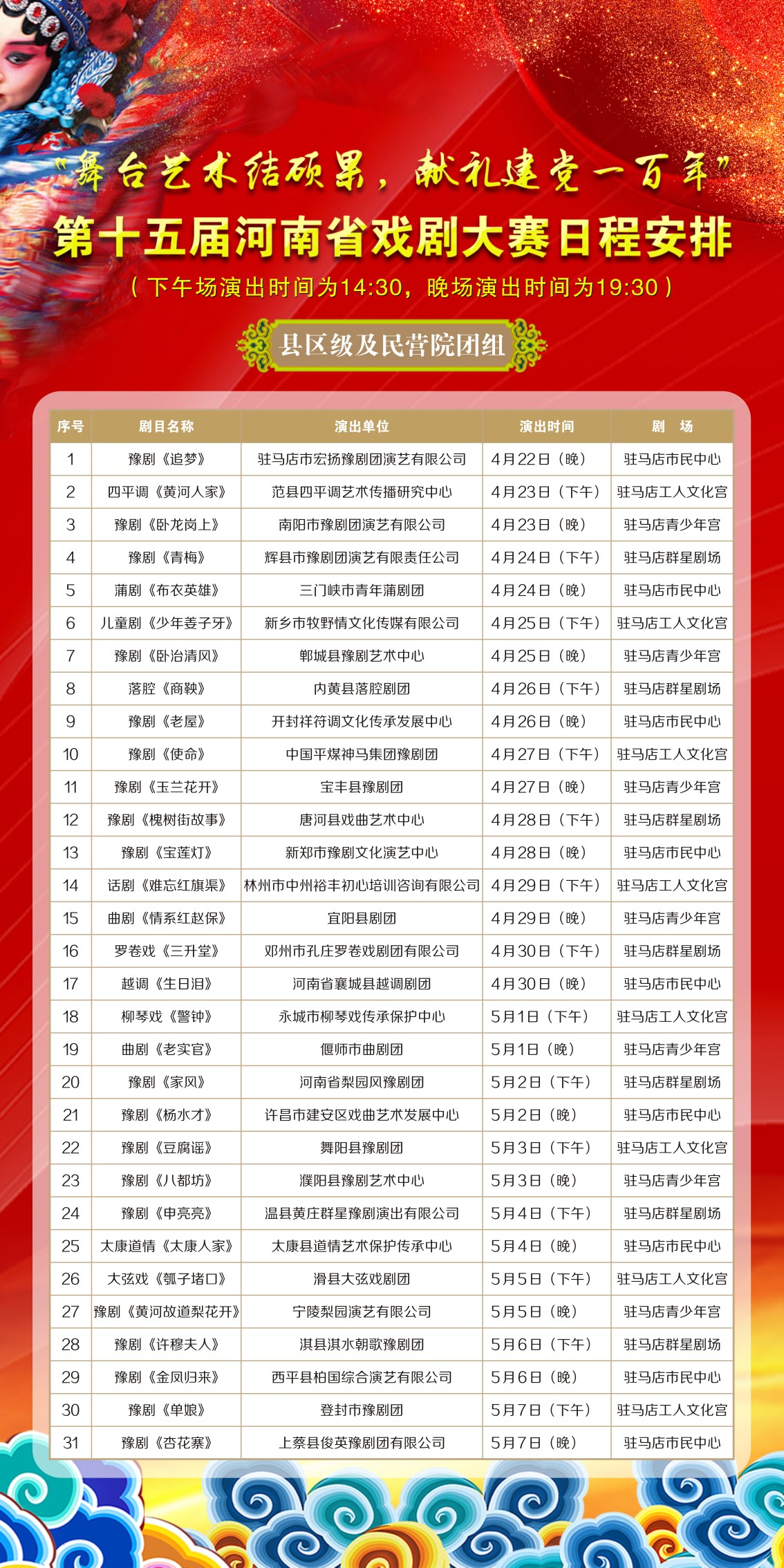 大河网讯(记者 莫韶华)豫剧、曲剧、蒲剧、道情、话剧、杂技……好戏连台。3月30日,记者从河南省文化和旅游厅获悉,“舞台艺术结硕果,献礼建党一百年”第十五届河南省戏剧大赛将于4月1日在驻马店隆重开幕。