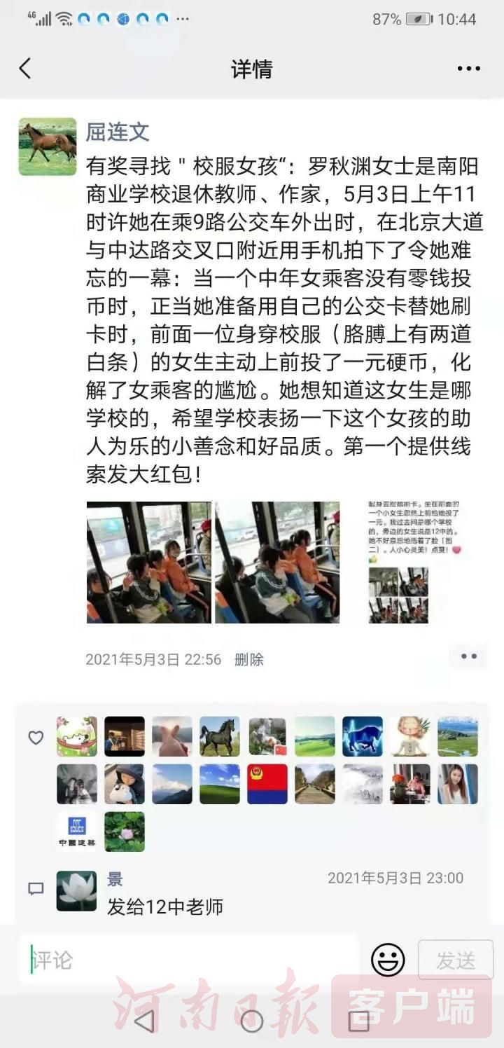 河南日报客户端记者孟向东通讯员屈连文李娟 5月3日上午,南阳市退休女教师罗秋渊在公交车上偶遇四位女生替一位老人垫付一元乘车费的一幕,当她拍照询问时却被姑娘们谢绝。通过众人接力寻找,4位助人女生被找到!...