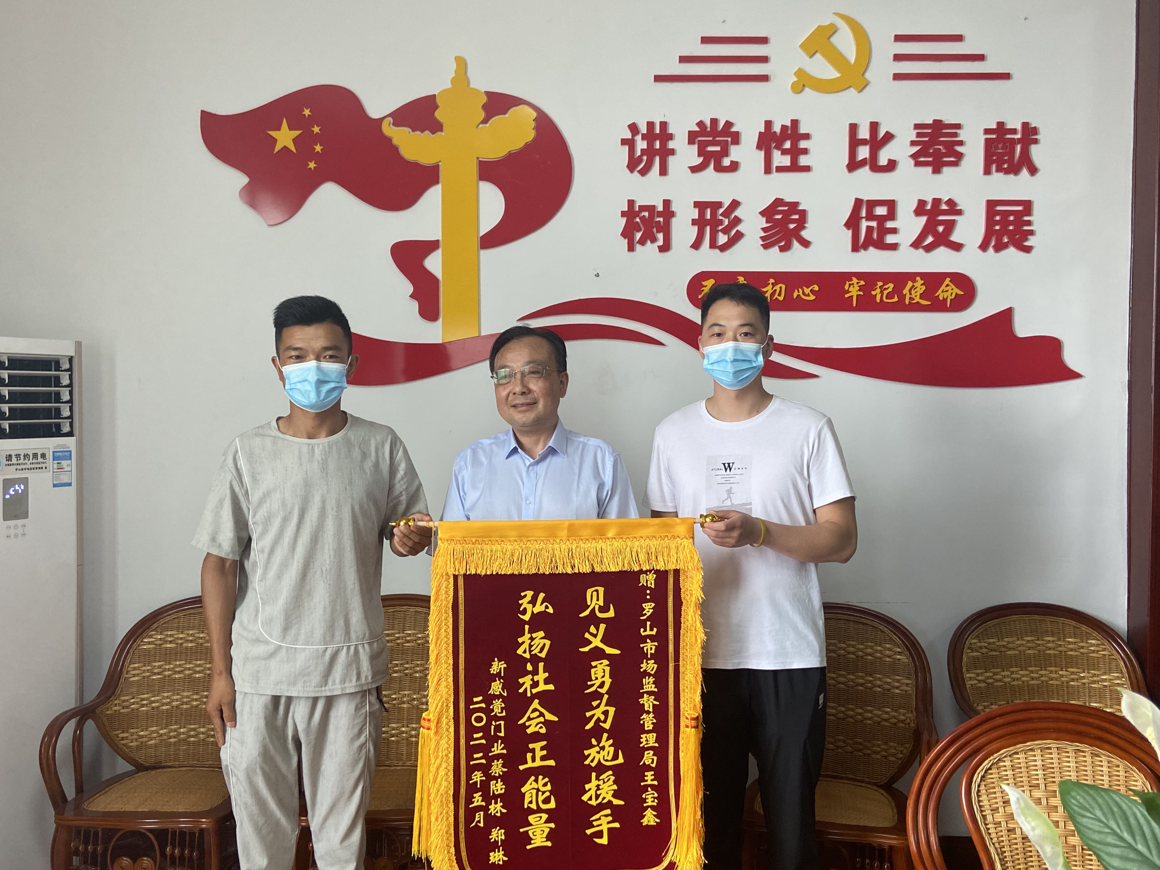 罗山县市场监管局党组书记、局长吴传胜(中间)和救人英雄王宝鑫(右一)共同接受当事人赠与的锦旗