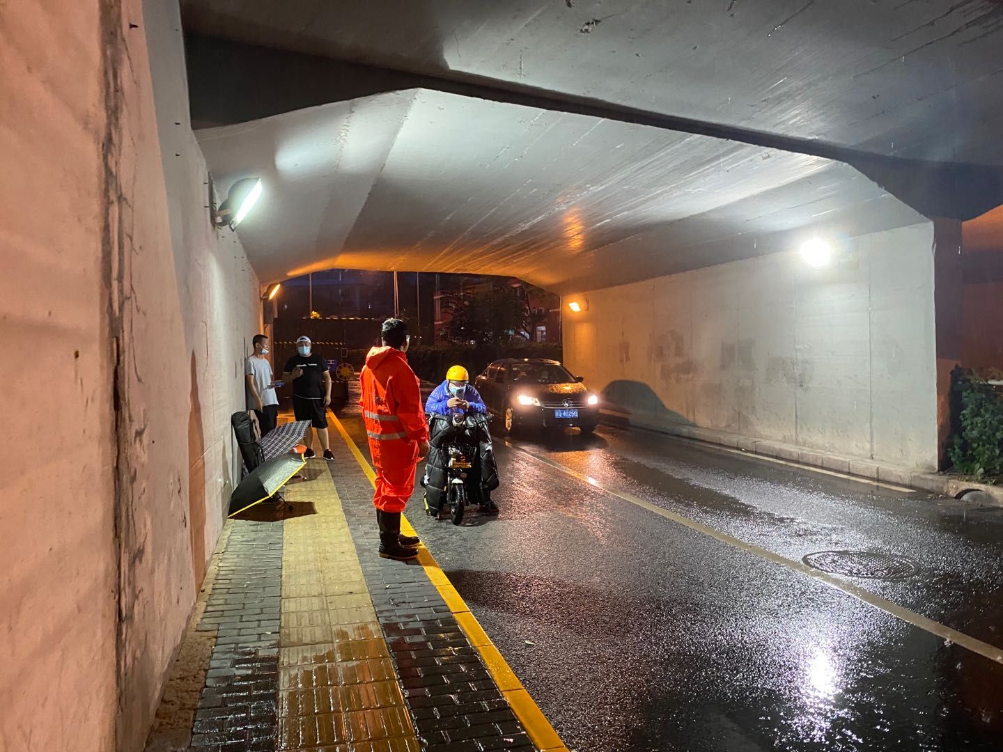 张道平取下淋湿的眼镜,在雨衣下的工作服擦了擦,工作服被汗湿透了,他神情严肃,说起老师傅们告诫他多次的话,“以前遇上大暴雨天气,桥下低洼处最易积水,水涨得很快,没过电瓶车和小车,没过人的情况都有过,意外事故容易发生,所以一定不能长时间滞留。”