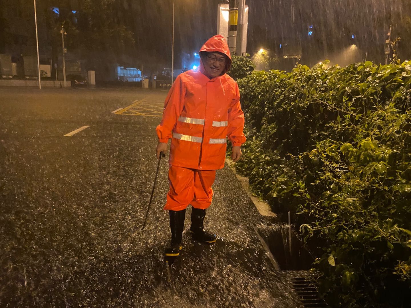 尽管如此,这个荧光橙色的身影仍然在暴雨里来回绕着桥洞走动巡查,去下一排雨水箅子,不时躬身清理排水口的淤泥和落叶,再守在一旁,观察水流是否顺畅。