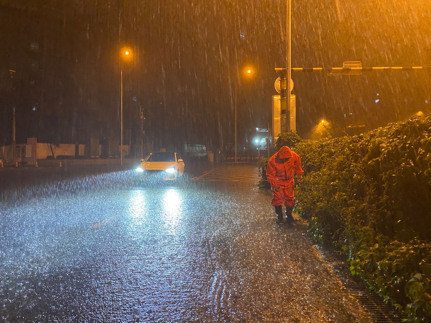 直到凌晨两点后,雨一点点小了,停了。路面几乎没了水流,这位橙黄色的守桥人才收拾工具,回到不远处的宿舍楼。