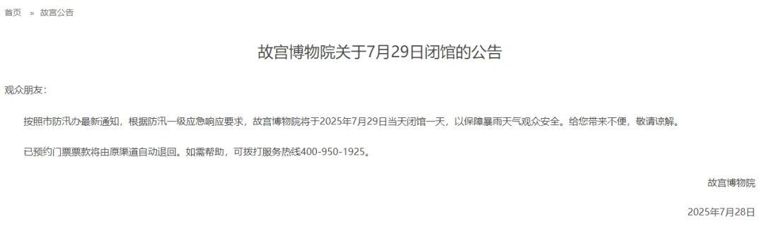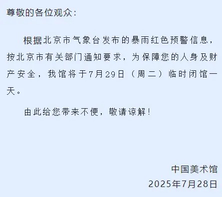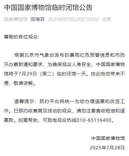 7月28日晚,故宫博物院发布公告称,按照北京市防汛办最新通知,根据防汛一级应急响应要求,故宫博物院将于2025年7月29日当天闭馆一天,以保障暴雨天气观众安全。已预约门票票款将由原渠道自动退回。如需帮助,可拨打服务热线400-950-1925。 7月29日,国家博物馆发布临时闭馆通告:根据北京市气象台发布的暴雨红色预警信息和市防汛办最新通知要求,为确保观众人身安全,中国国家博物馆将于7月29日(周二)临时闭馆一天。预约平台将统一办理退票和改签工作。已预约收费展及活动的观众,请注意查收短信和退票款。如需帮助,可致电观众热线010-65116400。 7月28日,首都博物馆发布公告,因受暴雨极端天气影响,为切实保障您的人身安全,北京大运河博物馆(首都博物馆东馆)将于7月29日(星期二)临时闭馆。 若您已购买7月29日“看·见殷商”展门票,该馆会于7月30日00:00前为您办理退票。退票后,您可在展览期间的任意开放日来馆,并按退票价格现场购票参观。 若您已购买7月29日的《甲骨风云》XR大空间沉浸展、MR导览混合现实体验票,该馆会于7月30日00:00前为您办理退票。 7月28日,中国人民抗日战争纪念馆发布临时闭馆公告,根据北京市气象台暴雨红色预警,为确保观众人身及财产安全,中国人民抗日战争纪念馆于7月29日(星期二)采取临时闭馆措施,开放时间视雨情而定。由此给您带来的不便,敬请谅解! 7月28日,国家图书馆发布临时闭馆通告,根据北京市气象台发布的暴雨红色预警信息,按有关部门通知要求,为保障您的人身安全,该馆将于7月29日(周二)临时闭馆一天。给您带来不便,敬请谅解。 7月28日,首都图书馆发布临时闭馆公告,按照市文化和旅游防汛要求,为保障读者人身安全,首都图书馆华威桥馆址(含春明簃阅读空间)、北京城市图书馆(含潞云筑-24小时图书馆)和首都图书馆大兴机场分馆自2025年7月28日(周一)18:00起采取临时闭馆措施,恢复开放时间另行通知。闭馆期间,将免除因闭馆造成的外借文献滞还费用。由此给您带来的不便,敬请谅解。 7月28日,中国美术馆发布闭馆公告,根据北京市气象台发布的暴雨红色预警信息,按北京市有关部门通知要求,为保障您的人身及财产安全,该馆将于7月29日(周二)临时闭馆一天。由此给您带来不便,敬请谅解! 7月28日,中国地质博物馆发布临时闭馆公告,根据北京市气象台发布的暴雨红色预警,为保障观众的人身及财产安全,中国地质博物馆于2025年7月29日(星期二)临时闭馆。 如您已预购7月29日门票,官方购票小程序将在30日凌晨自动为您退票退款。携程、美团将统一对7月29日门票做退票处理。您也可以选择自行退票。由此给您带来不便,敬请谅解。 7月28日,北京中轴线遗产保护中心发布公告,为保障观众人身安全,正阳门箭楼将于7月29日(周二)临时闭馆一天。由此给您带来不便,敬请谅解。预约平台将统一为您办理退票。更多信息请关注“北京中轴线遗产保护中心”微信公众号。 除以上机构外,北京还有多家博物馆、展览馆等发布临时闭馆公告。计划前往参观的公众,请查询相关展馆发布的官方信息,了解具体情况。(据北京晚报微信公众号)