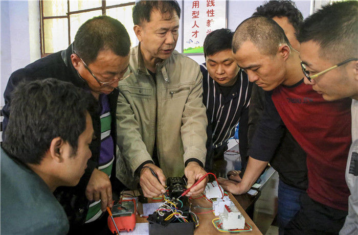 河北省饶阳县职业培训学校老师为学员讲解电动机操作技术(2018年5月22日摄)。饶阳县就业服务局依托职业培训学校分期面向辖区农民工开设电焊、美容、育婴等免费技能培训班,让农民工成为“技术农民”。新华社记者 李晓果 摄