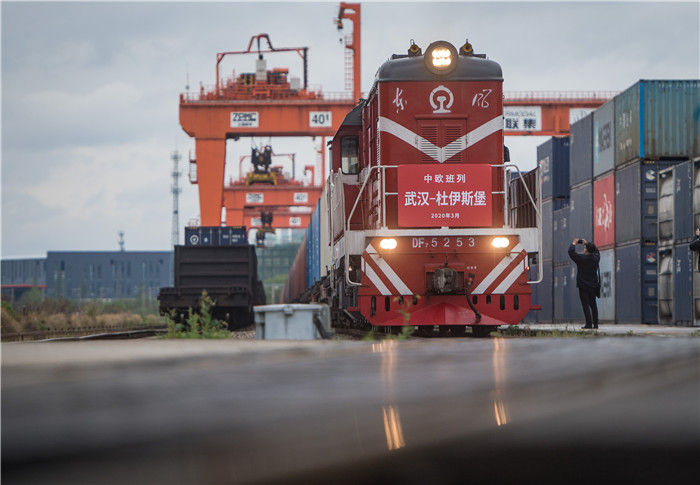 开往德国杜伊斯堡的中欧(武汉)班列从中铁联集武汉中心站驶出(2020年3月28日摄)。这是自疫情防控以来,从武汉开出的首趟中欧班列,标志着中欧班列(武汉)恢复常态化运营。新华社记者 肖艺九 摄