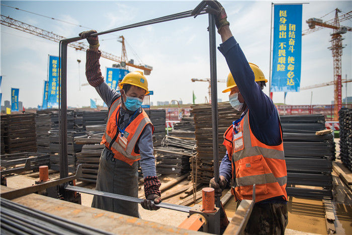 中建三局的建设者在武汉光谷大悦城建设工地作业(2020年4月28日摄)。新华社记者 肖艺九 摄