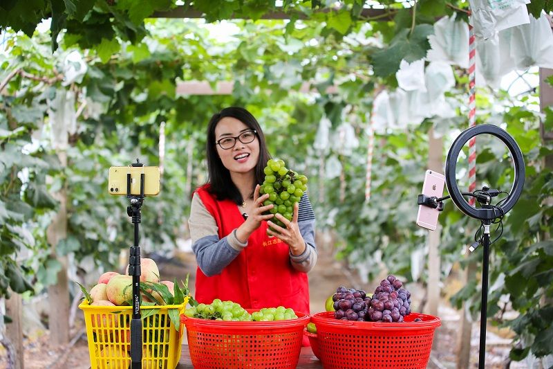 7月20日,江苏南通如皋市长江镇五零社区书记丁媛晶在葡萄园直播推销农产品(图片来源:人民视觉)