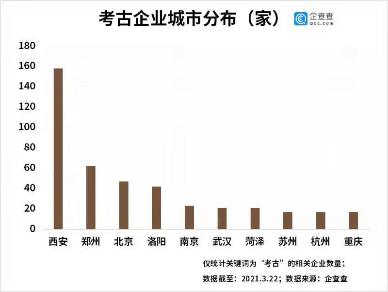 从城市分布来看,企查查数据显示,西安作为世界四大古都之一,历史文化底蕴深厚,考古相关企业数量遥遥领先,共158家,郑州、北京、洛阳以及南京等城市皆为古都,分别有考古企业62家、47家、42家和23家。