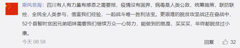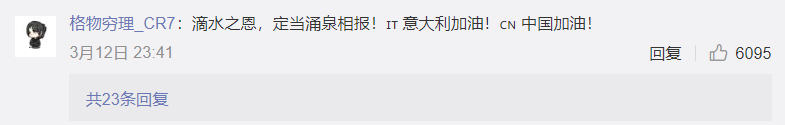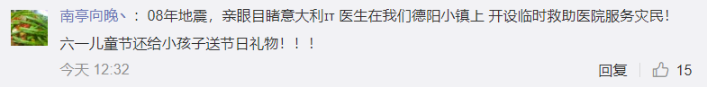 没错,当年汶川地震的时候,意大利给予了我们无私的帮助,如今,我们也应当向曾经施以援手的意大利做出回报,面对席卷全球的新冠肺炎,只有共同携手,才能战胜可怕的疫情。