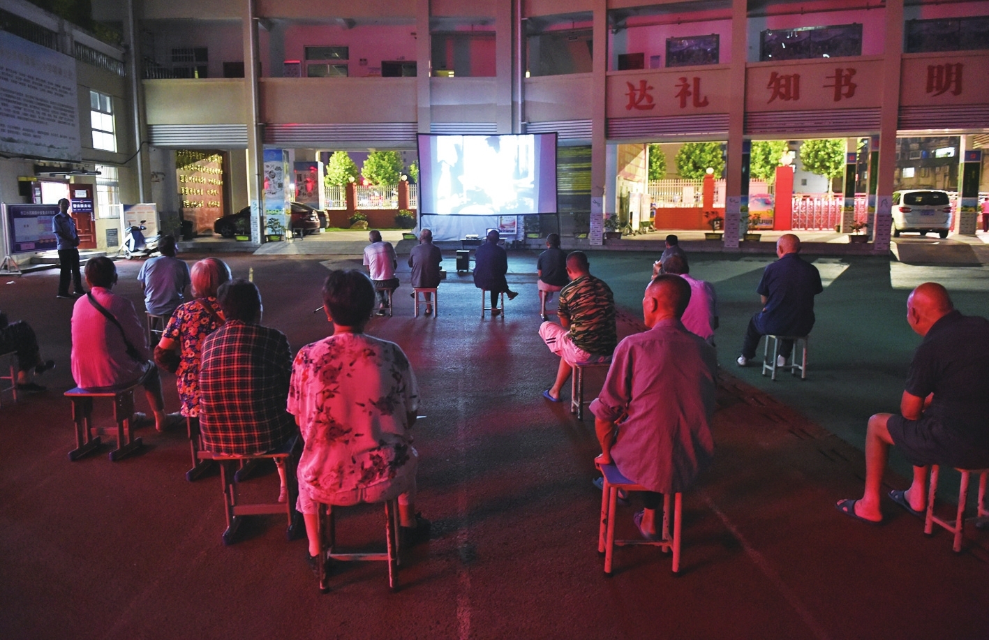 7月20日,转移安置的群众在安徽省安庆市迎江区华中路三小集中安置点看露天电影。新华社发