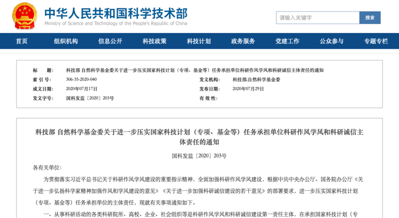 中国青年报客户端讯(中青报·中青网记者张茜)为全面加强科研作风学风建设,日前,科技部网站发布《科技部、自然科学基金委关于进一步压实国家科技计划(专项、基金等)任务承担单位科研作风学风和科研诚信主体责任...
